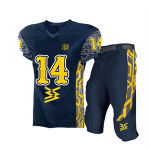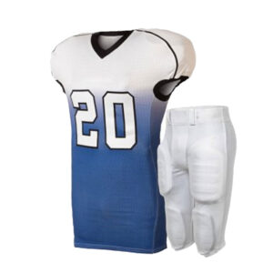 A standard football uniform consists of a jersey, pants and socks. Equipment generally includes knee pads, helmet with face mask and chin strap, pads (including shoulder and hip pads with tailbone protector and thigh guards), a visible mouthpiece that covers all upper teeth, and shoes with cleats.